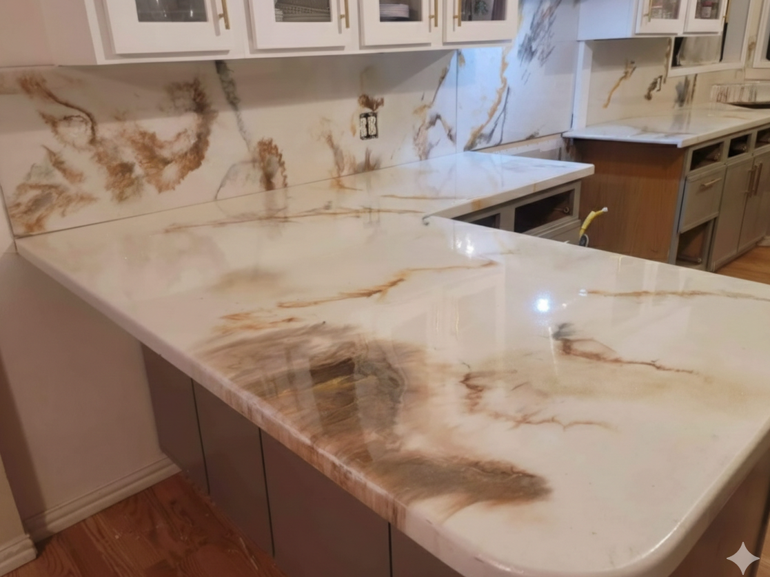 Enhance your home with our stone-inspired countertops. Made from durable epoxy, they resist germs and withstand heat, chips, and cracks. Enjoy the beauty at half the cost of natural stone and quick installation in just 3-7 days without demolition.